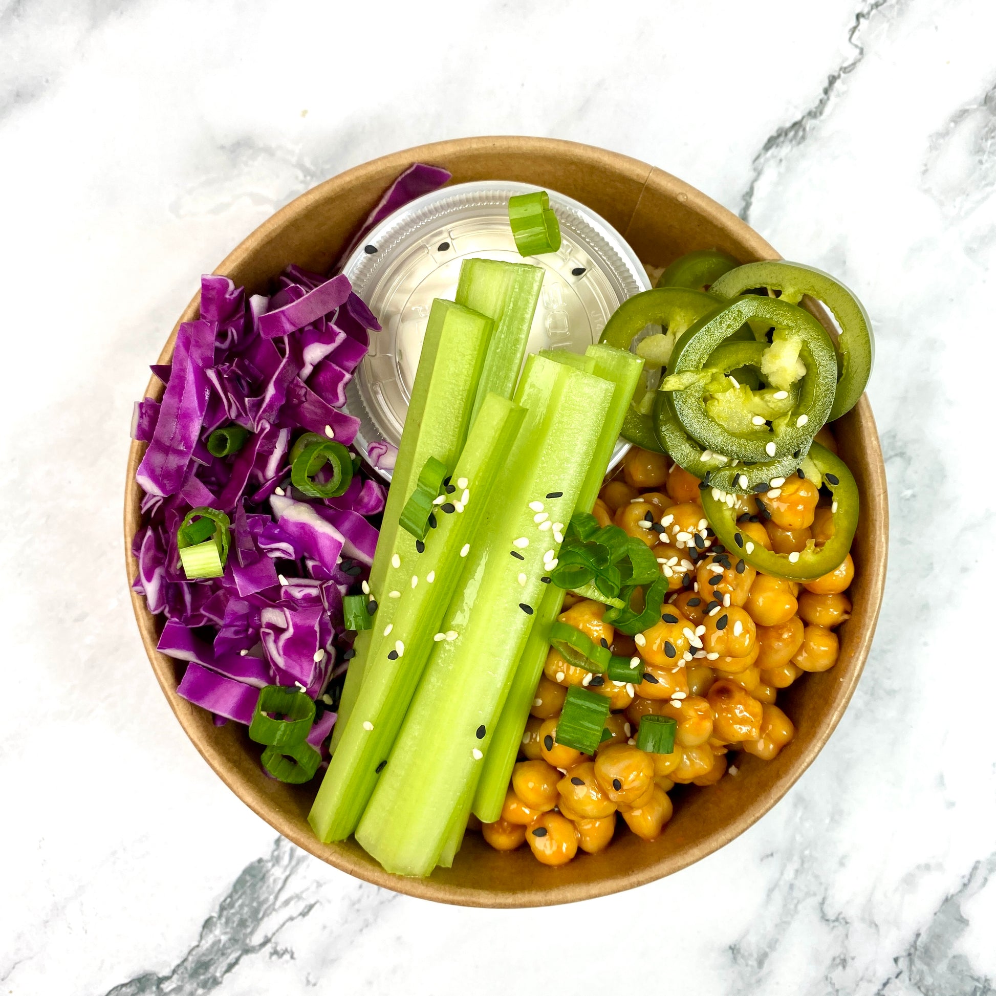 Roasted (not fried!) buffalo tofu, house-pickled jalapenos and crispy red cabbage on a bed of seasoned couscous with celery sticks and gfk vegan ranch for dipping