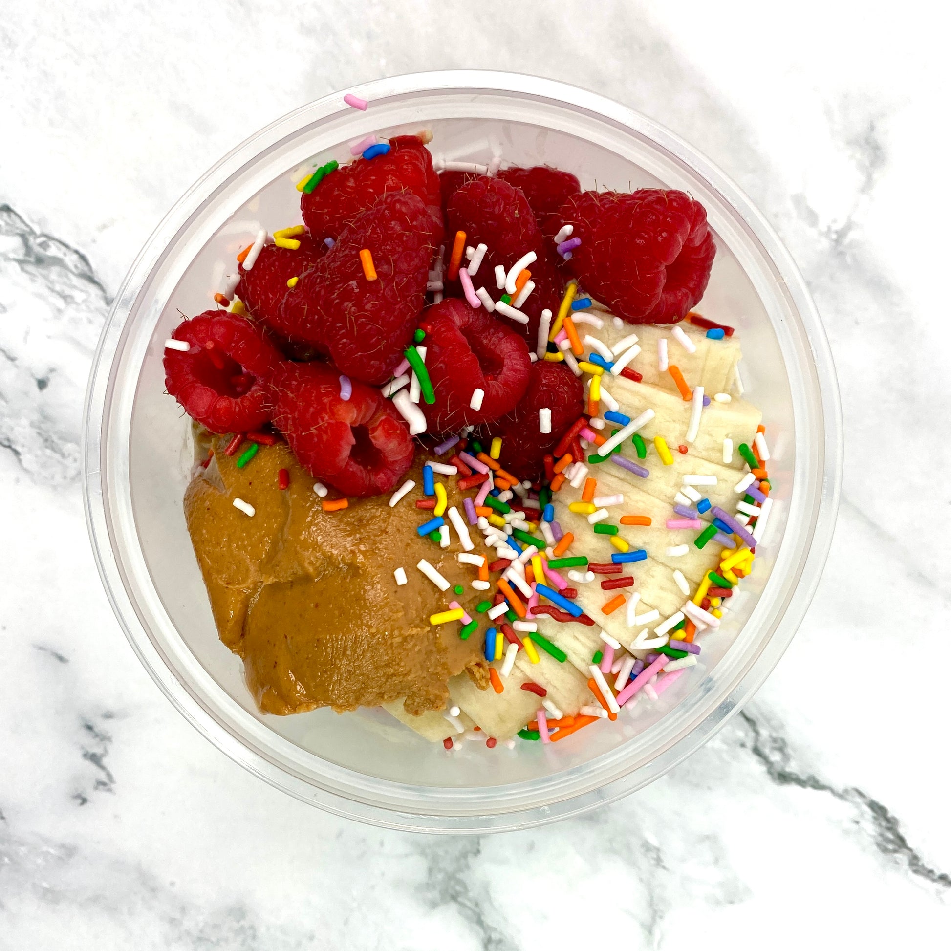 Celebrate waking up with a hearty portion of festive oats topped with fresh raspberries, banana and natural peanut butter